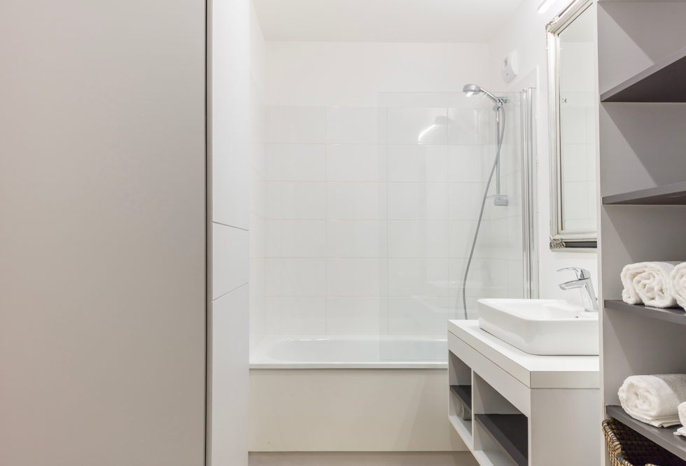 Salle de bain : Baignoire, machine à laver séchante, sèche-cheveux, fer à repasser, placards, linge de maison…